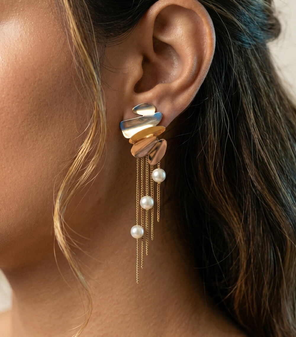 Contemporary gold-tone earrings with sculpted metal forms, pearl accents, and cascading chain tassels—elegant with a modern edge.
