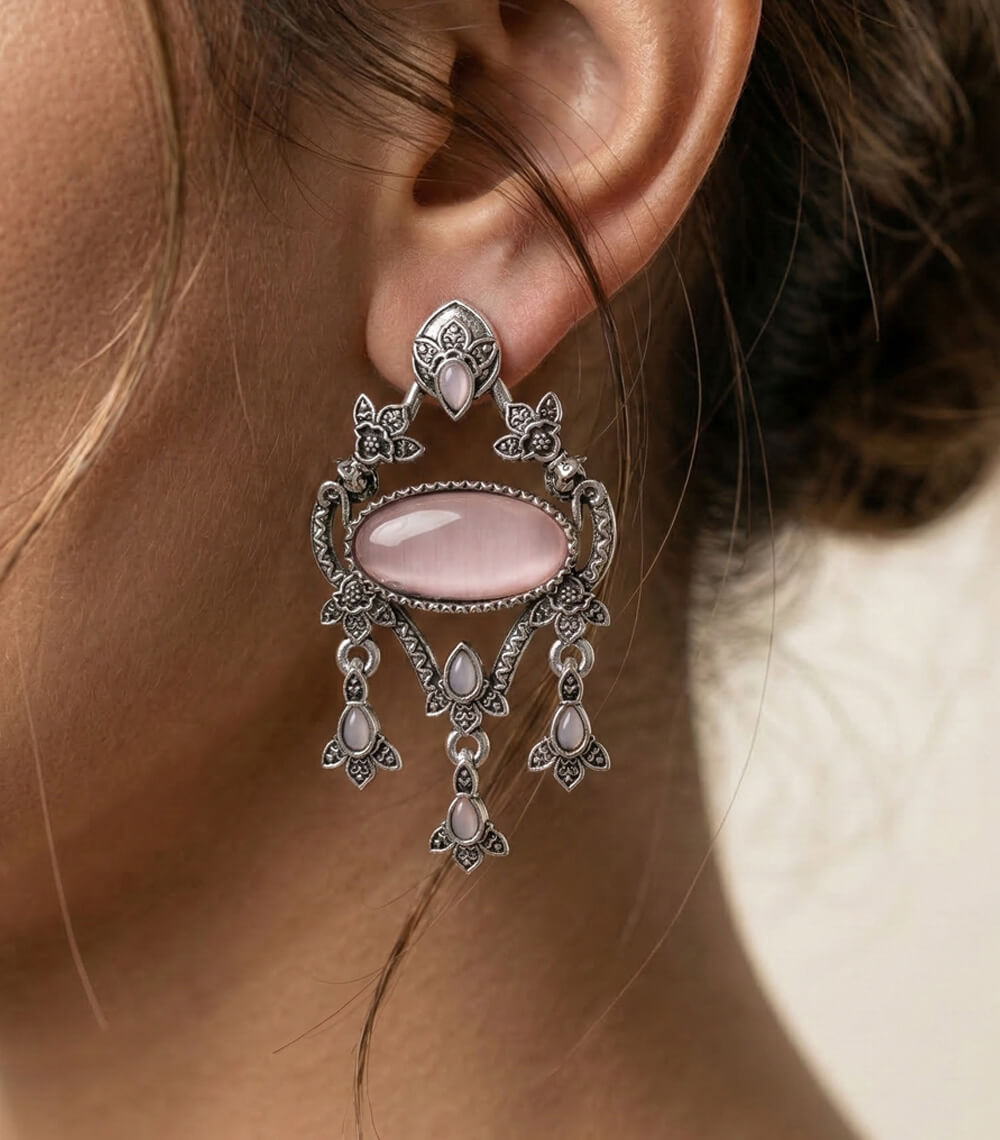 Grace your style with these beautifully crafted oxidised silver earrings, featuring a soft blush-toned oval stone at the center. Intricate floral detailing and delicate dangling accents add movement and charm. Lightweight yet statement-worthy, these earrings are perfect for festive occasions or elevating your everyday ethnic elegance.