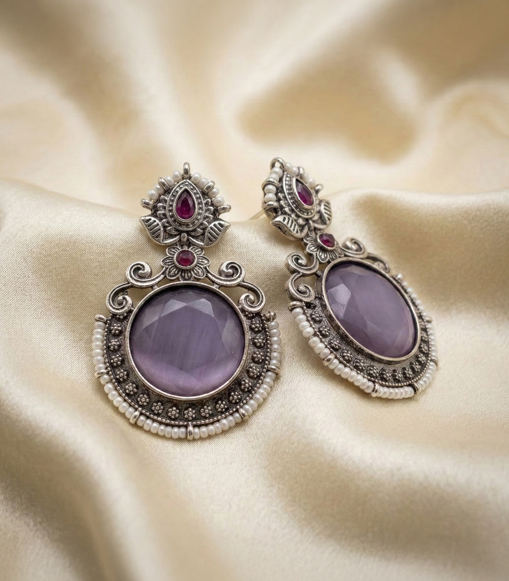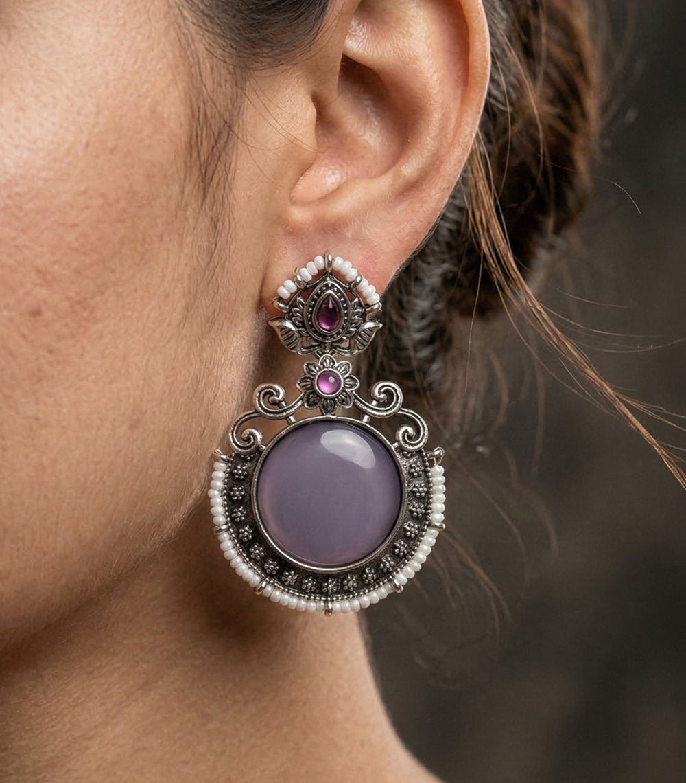 Elegant oxidised silver earrings featuring a bold purple stone centerpiece, delicately detailed with intricate patterns and pearl accents. A perfect blend of traditional charm and statement style.
