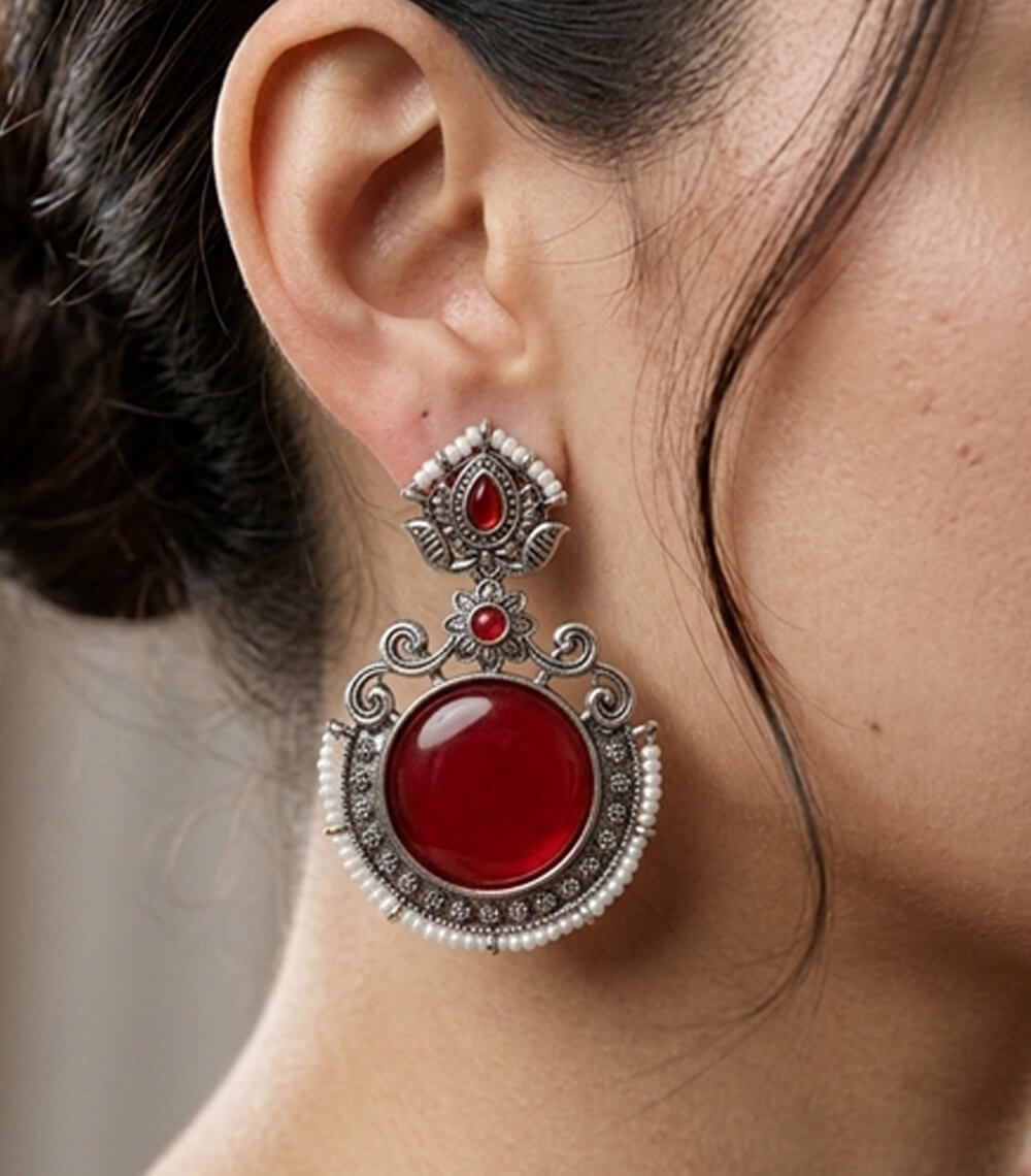 Elegant oxidised silver earrings featuring a bold red stone centerpiece, delicately detailed with intricate patterns and pearl accents. A perfect blend of traditional charm and statement style.